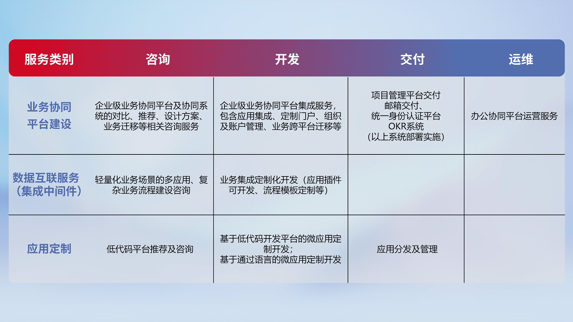 针对钉钉、、、企微、、、、IDaas等平台级产品提供产品的规划、、、方案、、、、交付、、、、定制化开发等服务,,实现如统一协同办公、、、智能客户服务、、、、混合会议管理、、、、智能数据查询、、、、等业务场景,,,,实现数字化转型。。